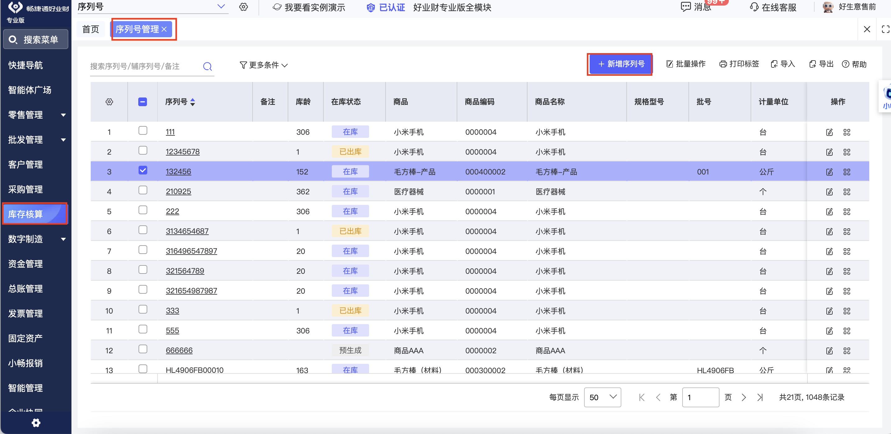 用畅捷通好业财的序列号管理模块,手机从采购、销售、租赁、回收到再次销售(再租),整个过程都能用“串码”(序列号)来追踪。就像给每台手机办了“身份证”,从采购入库开始,到第一次租出去、退租、评估,再到第二次租出去或卖掉,甚至最后报废,系统都会用这个唯一的序列号卡片来管,状态随时更新,数据实时同步。而且,还能用扫码枪自动录入,入库、盘点速度快多了,每台手机都能精准追踪,不用担心搞混。