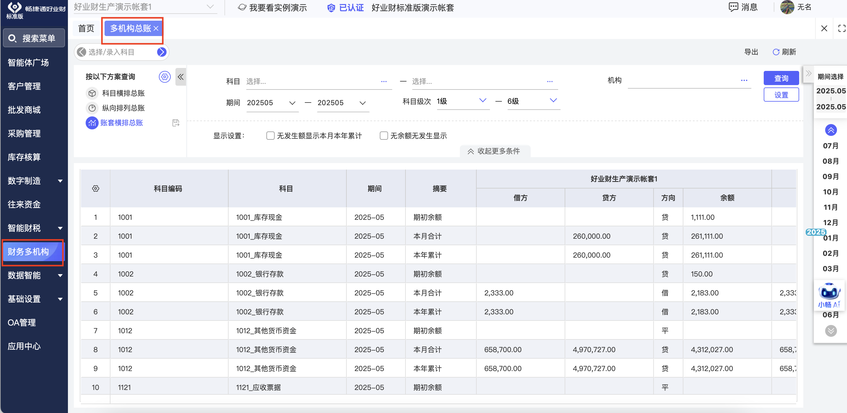方案阐述: 在好业财中为6家公司分别建立独立账套。被授权的管理员和老板,只需一个账号即可登录,轻松切换查看各家公司的财务、业务数据,并能快速生成合并报表,实时掌握集团整体经营状况。