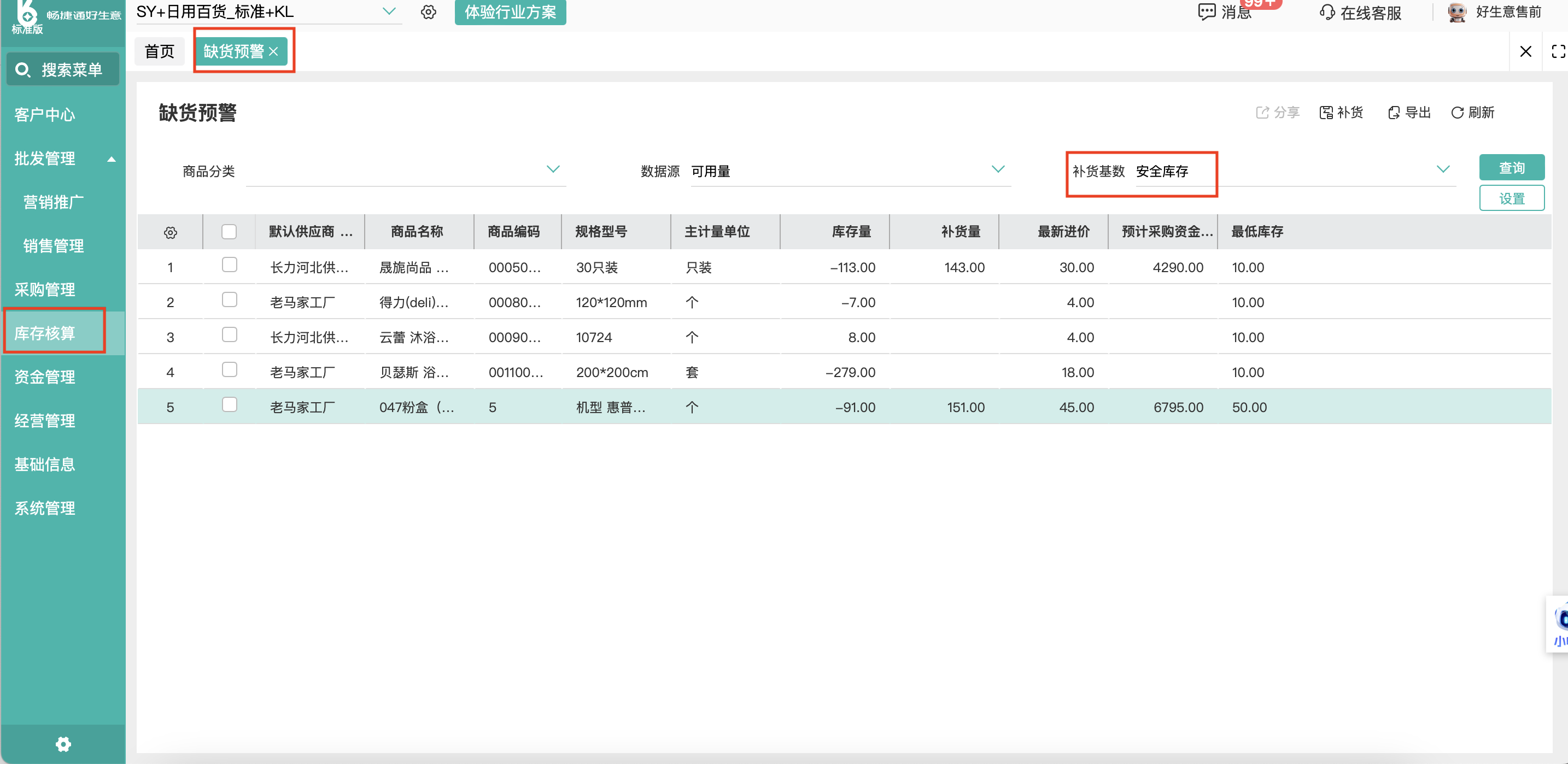 智能补货: 为每种商品设置安全库存上下限。当库存低于最低值时,系统会自动向采购员和老板发送缺货预警,并智能生成采购建议,确保畅销品不断货。