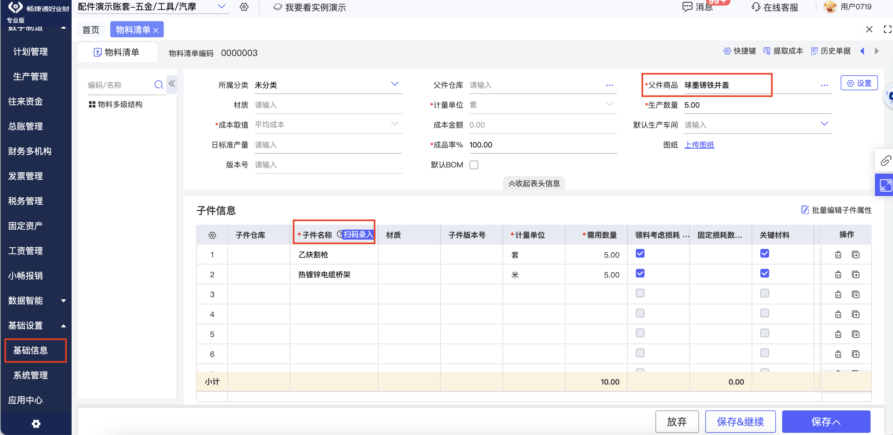 建立标准BOM清单: 为“提引器”、“除砂器”等每一种成品建立标准的物料清单(BOM),明确生产耗用的标准材料和数量。支持Excel批量导入,快速完成基础数据搭建。